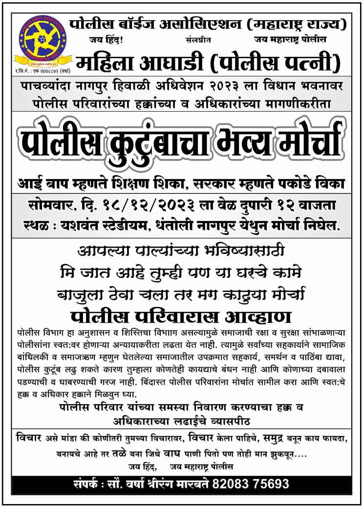 पाचव्यांदा नागपूर हिवाळी अधिवेशन २०२३ ला विधानभवनावर पोलीस परिवाराच्या हक्कांच्या व अधिकाऱ्यांच्या मागण्या.